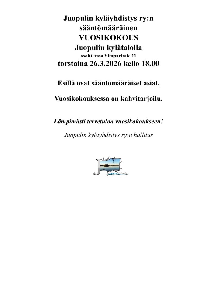 Juopuli.info on Juopulin kyläyhdistyksen ylläpitämä verkkosivusto. Sen tarkoituksena on viedä sinut matkalle tutustumaan kauniiseen kyläämme ja sen historiaan, sekä esitellä juopulilaista kielenperintöä. Juopuli.info toimii kyläyhdistyksen tiedotuskanavana ja palvelee niin kyläläisiä kuin muitakin Juopulin kylästä kiinnostuneita. Ilmoituksemme ajankohtaisista asioista ja tapahtumista välittyvät pääasiassa Facebookin kautta, joten käythän tykkäämässä sivustamme saadaksesi viimeisimmät uutiset ja ilmoitukset.